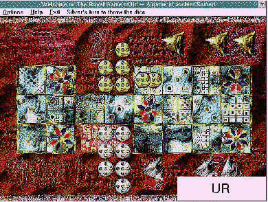 UR The Royal Game of Ur 1.0s is an interesting game for Windows based on an ancient Sumerian board game. You must throw pyramid-shaped dice in an effort to move your game pieces around the board, gathering rewards and sending your opponent back home. Features include excellent graphics, MIDI background music, and digitzed sound effects. (Reg.Fee: $15)