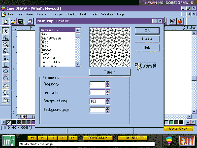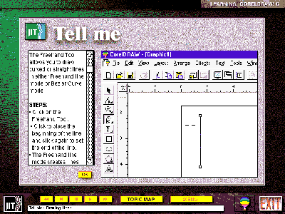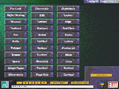 If you have the corresponding version of CorelDRAW! installed on your computer, LCD3 (or LCD6) maintains a link to it. So you can click on the Corel balloon button at any time to jump into CorelDRAW! and practise what you are learning. A corresponding Learn DRAW 3 or Learn DRAW 6 button appears on your Windows 95 taskbar for a quick return to the learning module.