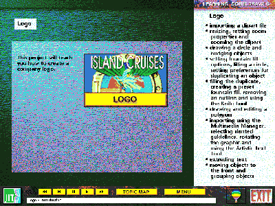The main menu or Topic Map, as it is called, is equipped with nine large icons. Clicking on any of these gives you access to the corresponding learning module. Each learning module guides you through a self-contained project, using a combination of audio, graphics and text to assist you in the process.