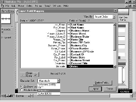 I created a simple address database using a template (Figure 1) but as with most templates, the layout didn't really suit the data I wanted to store. I dumped some data from another address program, and had no trouble importing the comma delimited text file into my empty database. There was a nice set up to select which field to import to the pre-defined fields, and either side could be skipped (Figure 2). When importing or exporting data there is a choice of four character sets: Windows (ANSI), DOS, Macintosh and Lotus (LICS). My Macintosh files were using the Macintosh character set, and those files which I created on the PC were using the Windows (ANSI) set quite seamlessly.