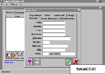 NAMES30 HigginSoft Names for Windows 3.0 is a powerful name, address and phone number database with an automatic dialer. Each entry can have up to five phone numbers, as well as email address, dependent's names and birthdates, important dates (spouse's birthday, anniversary, etc.), a free-form comment field, and a graphic image. Printing capabilities include detailed reports, a phone list, envelopes, and mailing labels. This is a very impressive package. (Reg Fee $15)