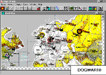 DOGWAR10* Dogs of War (32-bit) 1.0 is a multi-player war game for Win95 where you may play for the Allies (UK, US and USSR) or for the Axis Powers (Germany and Japan). Each turn consists of the development or purchase of weapons, movement, combat, collection of income, or the placement of new military units. You will need to apply military strategy as well as prudent economics to win. (Reg Fee $30)