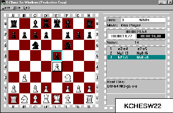 KCHESS K-Chess 2.2 is a chess game that shows its own calculations as you play. It includes a hint mode that calculates the best line of attack for several moves ahead. Play against someone else or challenge the computer to a match. K-Chess can be controlled by keyboard or mouse. (Reg Fee $20)