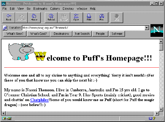 The original intention was that I would create a home page for O'Connor Christian School, and then that I would help Naomi create her own home page. However, November has been an extremely busy period for my consultancy business, so I left it to her to get on with it. Naomi has her own computer (an Aptiva 133Mhz Pentium) and has been busily using the Internet for school projects and for chatlines for the past 6 months, as she is probably already more proficient at navigating the Net than I am. I am pleased to be able to report that we are collecting her login details for her own Internet Project account, so now I might be able to start spending some serious time on the Net again!