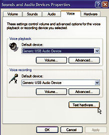 Click the Voice tab and set the Default Device for both playback and recording to your Generic USB Audio Device. |