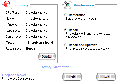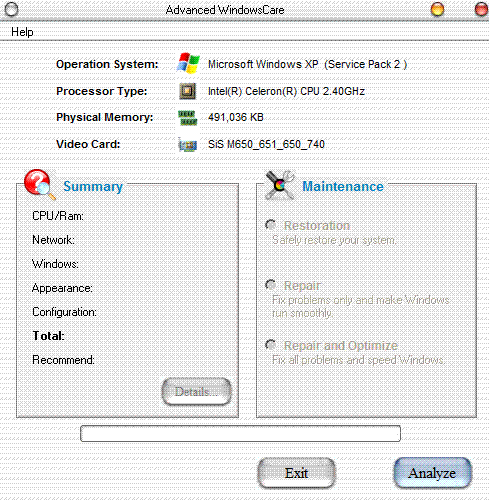 of the PC, but is the starting point for the Repair, Optimize and Restore functions.Clicking the Analyze button produces a Summary of problems found, grouped in the five categories listed in the left pane of the window. Clicking the Go! button will start the selected operation. ![]() |