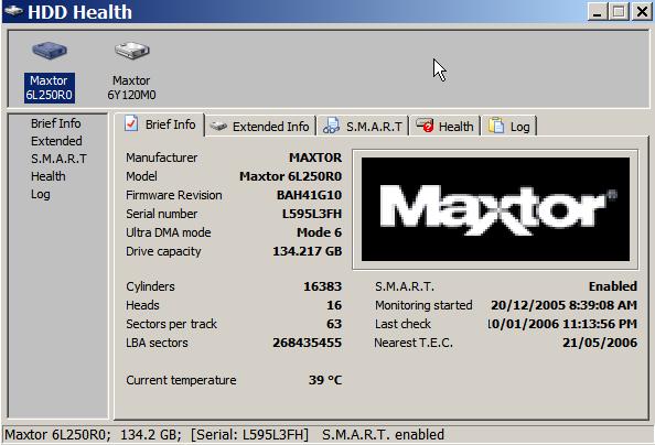 The temperature of one drive at a time can be seen by clicking on the drive's icon in the top panel. For example, for the Maxtor 6L350RO drive, the "current temperature" is 39 C. This information is updated regularly in the background by HDD Health, which will then update the temperature shown in the above display if it is open on your desktop. By "Showing HDD health" you are able to check the temperature of any drive whenever you like. However, the drive temperatures are NOT shown in the system tray and to see them you have to pop up the HDD Health Show HDD health window.