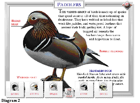 This display is a good example of the variety of both content and style to be found within the two products. As well as information about the various forms of cat (or bird) there are statues, paintings, curios and a wide variety of other objects that have to do with cats (or birds). In the museum section shown in the screen clip there is a painting of Mowgli battling with Shere Khan (from The Jungle Book by Rudyard Kipling), a large painting of a tiger and a smaller one of tiger hunting, a 'demon cat' statue, a tigereye agate in a glass case, a silk sheet of a Chinese white tiger and an ivory carving of a tiger. If any of these are clicked on then the viewer is 'taken in' for a closer look and a wide variety of additional information becomes available. For example, the painting of a tiger leads to a close in diagram of the tiger, a video clip on the striped coat, and sub screens about distribution, habitat, lifestyle, hunting, under threat and subspecies. There is also a See Also button that offers the user a choice of 6 further 'exhibits' in the museum. Some objects in the museum can be rotated through 360, so that the object can be viewed from all angles. The visual and auditory quality of the presentation is excellent throughout, and the video clips, although fairly short, are of good quality also. Diagram 2 (below) is an example of a topic screen, in this case from Virtual Reality Bird.