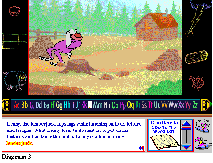 While the 'story' at the bottom of the screen is read an animation takes place in the main window. These animations are lengthy and very appealing to young children. In the example shown in Diagram 3, 'Lennie the lumberjack', lops logs, lunches on liver, lettuce and lasagne, belches loudly then does the limbo in his leotard (shades of Monty Python!) Young kids love this sort of zany humour, and mine have replayed a number of the animations repeatedly. Their other favourite is Igor the International Intelligence Agent, who found himself isolated in an igloo etc.