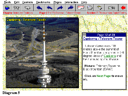 While the text window can be re-positioned and re-sized, the picture window is fixed, although it can be shown full screen or zoomed in on. In fact one can zoom in to multiple levels on any portion of the screen, although there is a significant loss of visual clarity when this is done. By way of example, there are 20 'pages' of information on Canberra, from its foundation through to present day, with a different picture for each page and text that varies from one to ten paragraphs in length. The tool bar includes tools for Options, Search, going forward or back within the current subject, contents page, printing, adding notes and playing videos (where appropriate). The pictures are of good quality throughout the program, and they are supplemented by 92 videos. These are varied and generally of good quality, though they are rather short (up to 20 seconds). They can be shown in a variety of screen sizes.