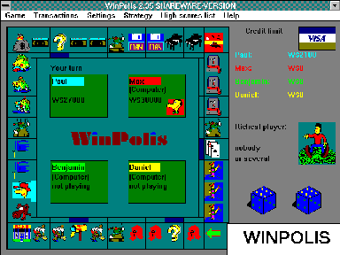 WINPOLIS WinPolis 2.35 is a Monopoly-like board game for Windows. Up to four human/computer players can compete, buying and selling businesses and raining financial ruin on everyone in sight. (Reg.Fee: $25)