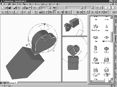 The manual also explains what all the cryptic graphics on the toolbar are all about. I found the use of proprietary names like TriBalltm; and IntelliShapestm; to be slightly nauseating, but then again these were concepts and tools that really transcended any existing terms. These concepts and tools are also appallingly powerful, so one can’t be too critical really. IntelliShapes are the idea that all objects know how to interact with each other in intuitive ways, including the way they snap to each other (called, rather predictably SmartSnaptm;). The TriBall puts a kind of sphere thing around the object you’re working on and allows precise adjustment of the objects rotation and displacement on each of 3 axes.