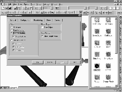 Figure 2 also shows the scene properties dialogue, which allows you to, among other things, set the rendering settings. Leaving it on smooth shading, the SmartRendertm; feature actually acts like it says, in that while manipulating shapes it uses a plain, shaded version that one can spin and shift quickly and smoothly, but once you leave the mouse still for more than a few seconds, it will render the scene showing the colours and textures that have been applied.