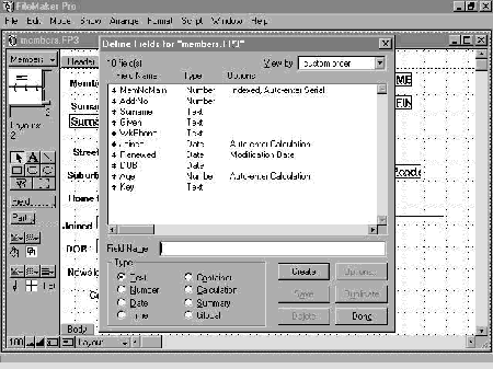Creating a database from scratch is well presented. The fields are easy to define and don't require a set length to be thought of in the planning. Field types are text, number, date, time, container (for graphics?), calculation, summary and global. Further formatting is available in the data declaration area or on the form in layout view. After the fields are created, the form is automatically created, with a choice of styles. List boxes, drop down menus, check boxes and radio buttons are easily set up directly on the form. Boolean fields are best handled by radio buttons or check boxes with a Value List of "Yes" and "No". Fields may be altered, or extra fields added as an afterthought, by using File/Define Fields (Figure 3).