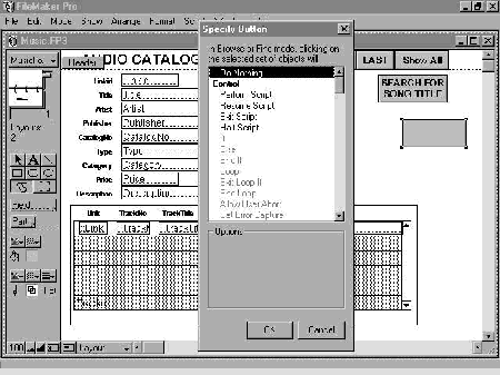 Attaching commands or Scripts to buttons was quite straightforward with a good menu listing all actions that can be performed "live" on the database from the user menus. These commands are grouped by Control (program statements), Navigation, Sort/Find/Print, Editing, Fields, Records, Import/Export, Window, Files, Spelling and Miscellaneous (Figure 4).