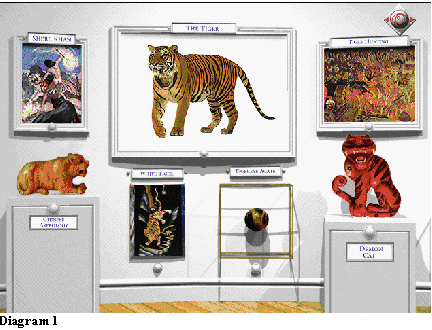 'Virtual reality' in this context means that the user is made to feel that they are exploring a museum rather than looking up information in a multimedia reference 'book'. After a brief introductory sequence the user finds themself standing at the entrance to a museum. Beyond the marble archway a variety of exhibits are visible, some in the middle of a well polished wooden floor. The level of realism is such that the reflection from some of the exhibits can be seen in the floor. In the background there are animal noises and/or music. One moves along by pointing and clicking with the mouse. Diagram 1 (below) is an example of a display within Virtual Reality Cat.