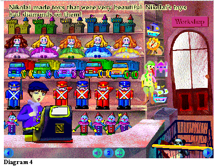 In 'explore' mode the user can click and point at various objects in order to activate a variety of animations or games. The animations are quite varied and some of them have excellent sound effects. My daughter's favourites were the skier who races over the rooftops (to the accompaniment of the Batman theme) and a chorus line of cats singing, "There's no better way to pass the day than making more of me" (several more lines follow). There are also a number of games (eg. write a letter to Santa, use the toy machine to create toy cats in a variety of outfits), and educational activities. In the toy shop illustrated in Diagram 4 the user can select toys from the shelf and help Nikolai fill out the bill by calculating subtotals (eg. three dolls @ $4 is $12) and the overall total. There are also educational explanations or games about how snowflakes are formed, the months of the year and temperature scales. In 'explore' mode it is possible to jump around the different pages, and also to replay the narrative of the current page.